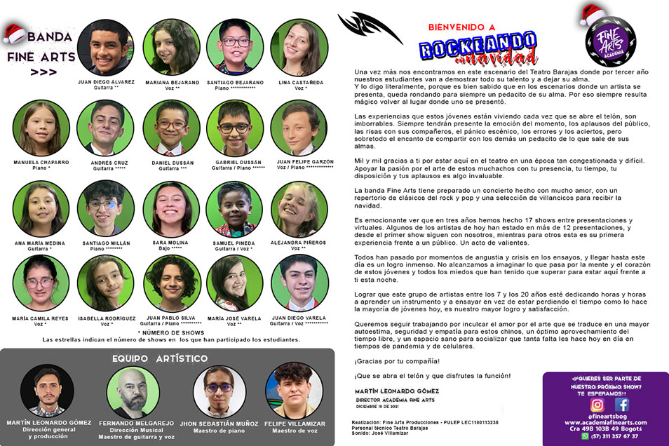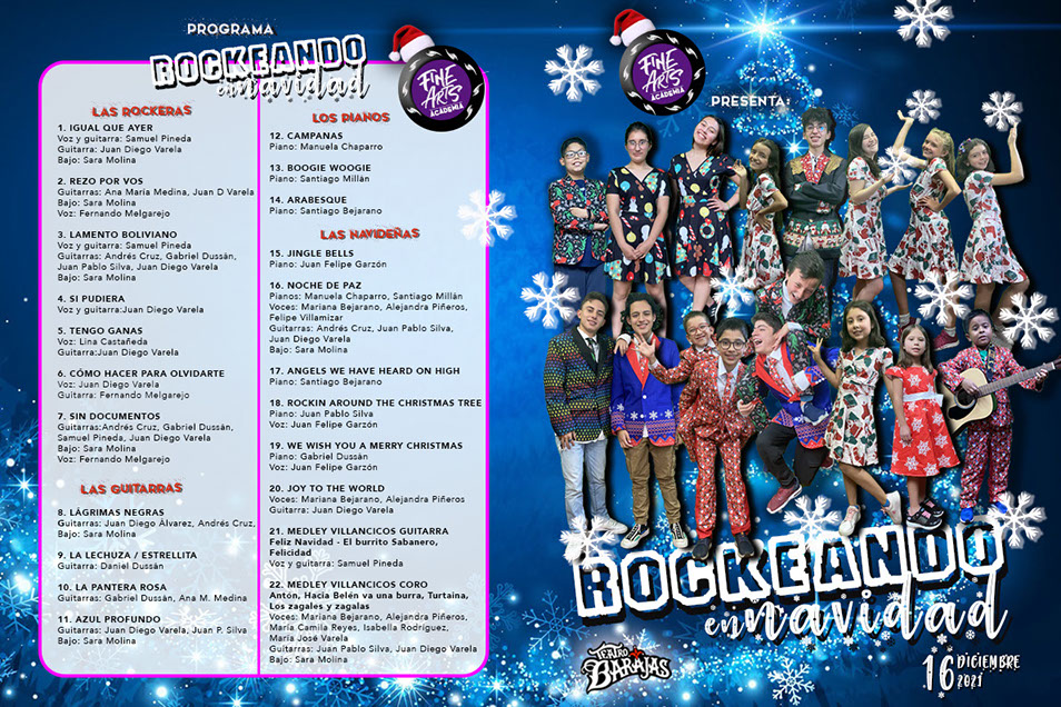 Para cerrar 2021, hicimos un gran concierto en el Teatro Barajas de Bogotá el 16 de diciembre, en el que nuestros estudiantes de 6 a 20 años, interpretaron clásicos del rock en español, villancicos y piezas instrumentales de piano y guitarra.